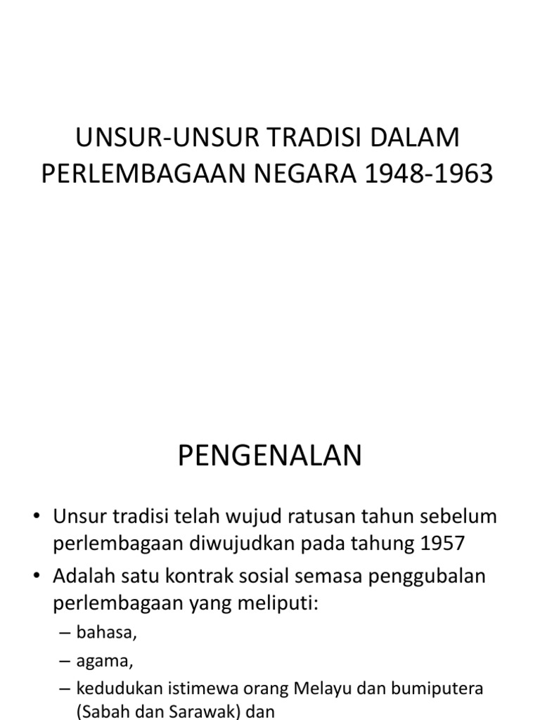 Keunikan perlembagaan persekutuan ini dapat dilihat berasaskan unsur unsur tradisi yang menjadi tiang seri kepada undang undang tertinggi negara ini. Antara unsur unsur tradisi dalam perlembagaan persekutuan ialah pemerintahan beraja kedudukan istimewa orang melayu agama islam dan bahasa melayu. Bahasa kebangsaan agama persekutuan. Pengenalan unsur tradisi telah wujud ratusan tahun sebelum perlembagaan diwujudkan pada tahung 1957 adalah satu kontrak sosial semasa penggubalan perlembagaan yang meliputi.