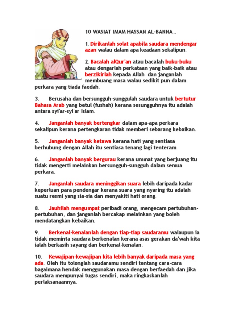 Gerakan dakwah al ikhwanul muslimun yang dipimpinnya terbukti telah memberikan kontribusi besar bagi kebangkitan umat islam dari tidur mereka yang panjang. 10 wasiat imam hassan al banna semoga nasihat ini boleh dijadikan panduan hidup kita. 10 wasiat hasan al banna imam hasan al bana pendiri gerakan dakwah ikhwan yang terkenal ke seluruh dunia banyak meninggalkan catatan penting pada sejarah perjuangan islam modern. Dalam usahanya menghafal al quran bapanya telah memberi banyak bantuan.